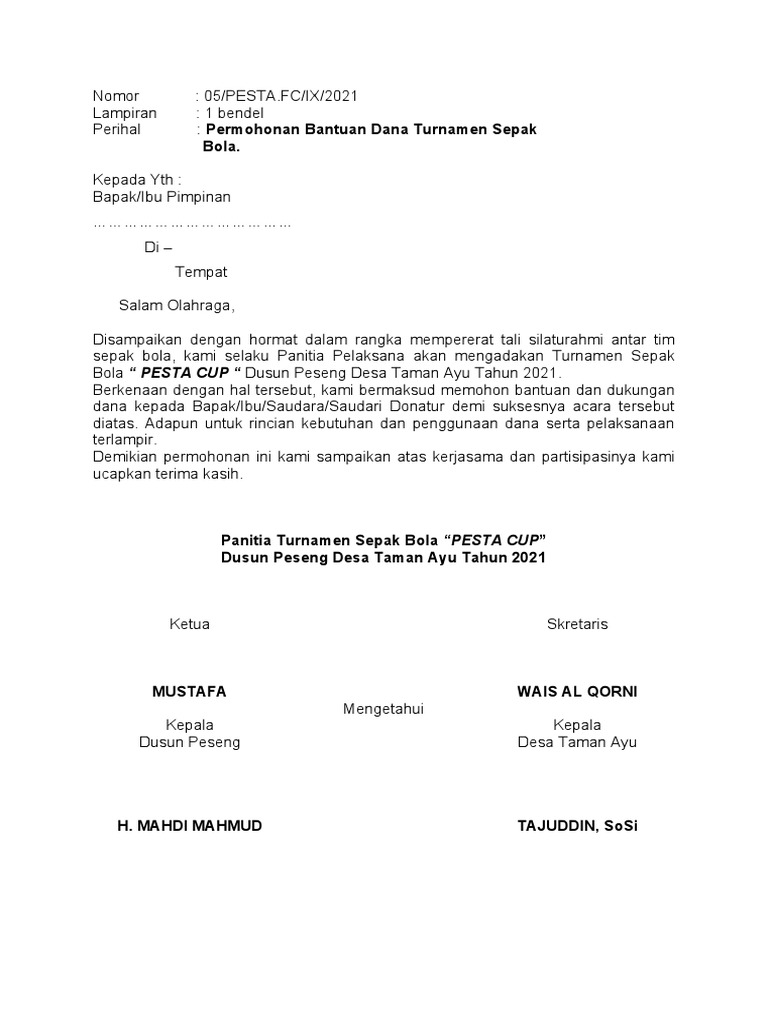 Contoh proposal permohonan bantuan dana contoh proposal. Download contoh proposal sepak bola format doc diatas dengan klik link disini kata penutup pembuatan proposal pertandingan sepakbola memang perlu keahlian di bidang penulisan proposal yang baik supaya nantinya kamu bisa memberikan laporan detail kegiatan tersebut kepada pihak sponsor.