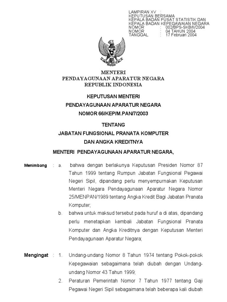Jabatan Fungsional Pranat Komputer dan Angka Kreditnya. 4. Keputusan Bersama Kepala Badan Pusat Statistik dan Kepala Badan Kepegawaian Negara nomor Peraturan Kepala Badan Pusat Statistik Nomor 16 Tahun 2008. Petunjuk Teknis Penilaian Angka Kredit Pranata Komputer. C. Pranata Komputer Utama ditetapkan Angka Kreditnya oleh Kepala BPS. D. Penetapan Angka Kredit untuk Pranata Komputer Pelaksana sampai dengan Pranata Komputer Madya dilingkungan masing - masing oleh Pimpinan Unit Kerja/Pejabat yang membidangi Teknologi Informasi... Angka kredit minimal yang harus dikumpulkan adalah : 1. Asisten Pranata Komputer Madya sebanyak 20 angka kredit. Selain itu, Pejabat Pranata Komputer juga dapat diberhentikan dari jabatannya, apabila Pejabat Pranata Komputer dijatuhi hukuman disiplin Pegawai Negri Sipil... pelaksanaan pengelolaan administrasi angka kredit jabatan fungsional; ... pengolah data dan Jabatan Fungsional Pranata Komputer.63 pages