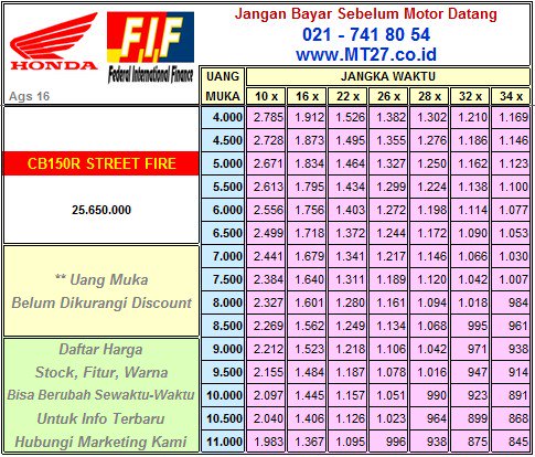 Harga motor CB 150 R baru Rp. 23.075.000 Sementara gambaran harga cicilan kredit motor Honda berdasarkan model dan Type Motor dapat dilihat pada pricelist terbaru di bawah ini, berdasarkan cicilan / DP dan besar angsuran bulanan