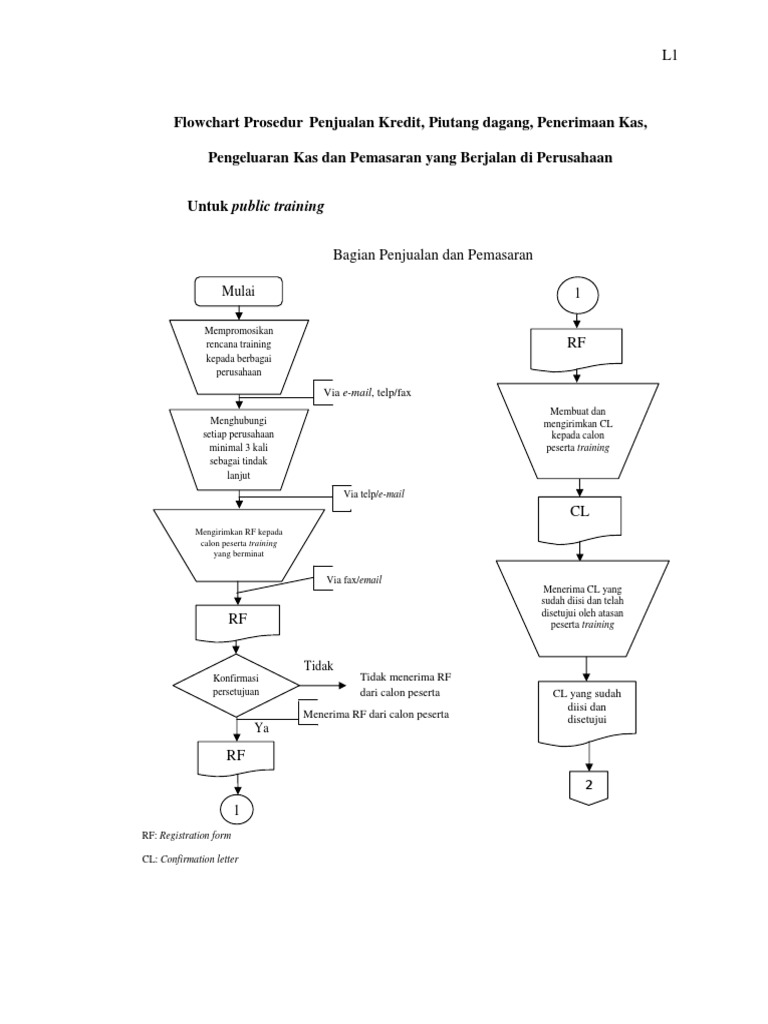 Flowchart Prosedur Penjualan Kredit, Piutang dagang, Penerimaan Kas, Pengeluaran Kas dan Pemasaran yang Berjalan di Perusahaan Untuk public training Bagian Penjualan dan Pemasaran Mulai 1 Mempromosikan rencana training kepada berbagai perusahaan RF Via e-mail, telp/fax Membuat dan mengirimkan CL kepada calon peserta training Contoh bagan alir ...