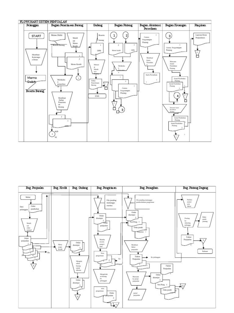 Berikut ini contoh Prosedur Penjualan Kredit (Analytic Flowchart): · Customer mengirimkan Surat Order Barang ke Bagian Penjualan. Setelah menerima Surat Order Barang dari Customer, Bagian Penjualan membuat dan menandatangani Faktur Penjualan yang dirangkap 3, lembar pertama dan lemabar kedua untuk Bagian Pengiriman, sedangkan lembar ketiga ...