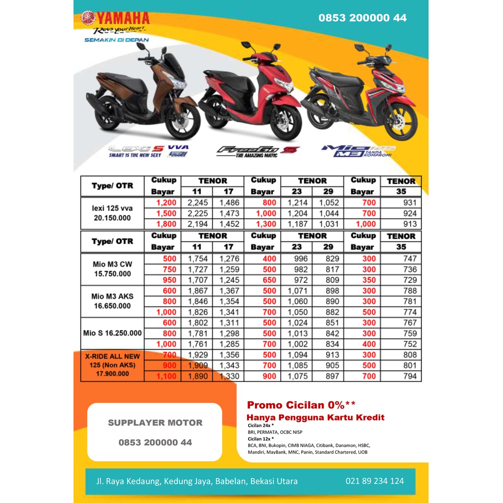 Dapatkan DP super murah dari kami PT MM yamaha yang berlokasi di jalan soreang no 104 bandung, DP mulai 700rban saja untuk semua type. Yamaha matik no type motor dp cicilan 35X 1 new mio M3 CW 700000 672000 2 mio z 700000 686000 3...