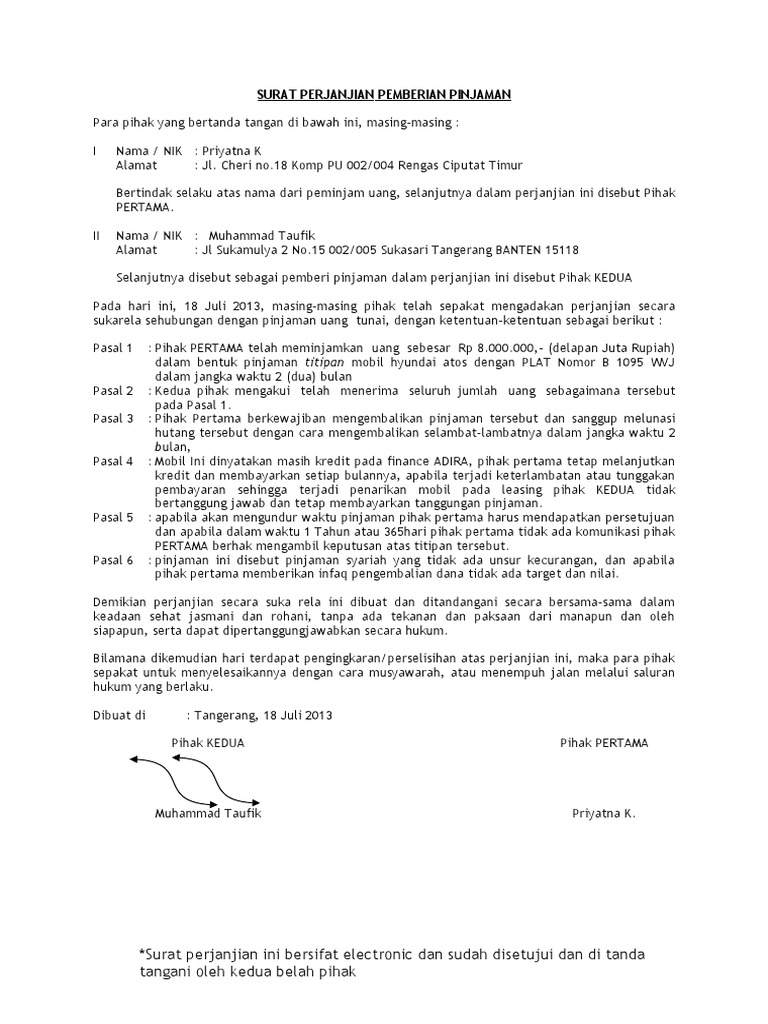 Contoh surat pinjaman uang perorangan. Kemarin gw menebus semua tabungan emas yang gw gadaikan di awal pandemi (di Pegadaian yang BUMN itu ya bukan yang swasta2). Pandemi bikin keuangan ortu, mertua dan saudara-saudara kita berantakan. Gw dan suami kerja dari pagi sampe pagi lagi tapi cuma bisa merasakan <50% dari penghasilan gabungan kita karena harus support mereka semua lol. Tapi, di sisi lain kita bersyukur masih bisa bantu mereka semua. Selama masih ada penghasilan, gw percaya bencana2 keuangan pasti bisa terlewati. ... Contoh dari common law adalah aturan yang dibuat oleh hakim yang mengatakan bahwa orang memiliki kewajiban untuk membaca kontrak. ... Uang atau properti atas nama tunggal pasangan Anda akan dianggap sebagai milik mereka sendiri, kecuali jika Anda dapat membuktikan sebaliknya. ... Jika tidak ada surat wasiat, pengadilan akan menyerahkan semuanya ...