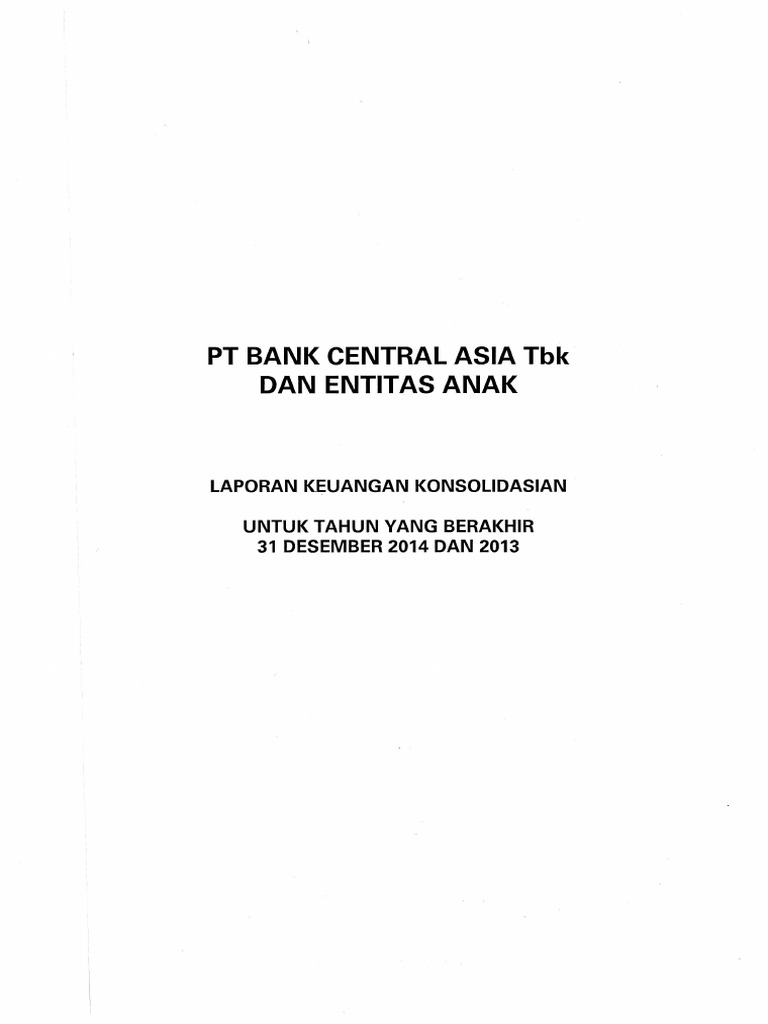 laporan keuangan Bank BCA tahun 2014 - [PDF Document] 8 Dec 2015 — PT BANK CENTRAL ASIA Tbk DAN ENTITAS ANAK. LAPORAN KEUANGAN KONSOLIDASIAN. TAHUN BERAKHIR 31 DESEMBER 2014 DAN 2013. DAFTAR ISI. Halaman.
