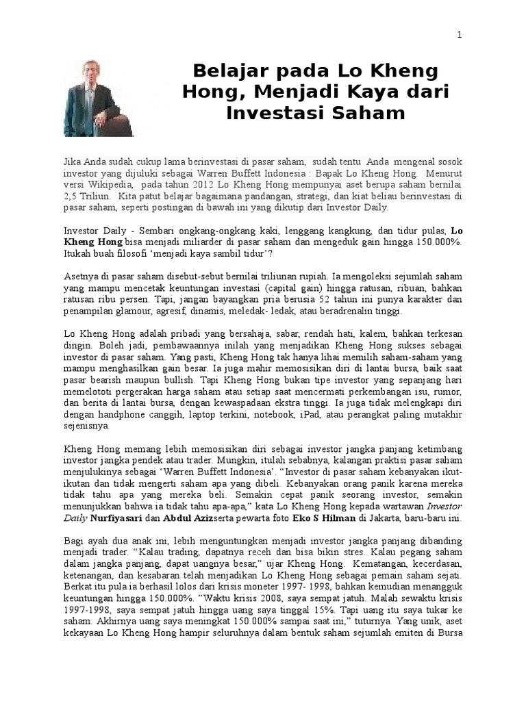 Saran Lo Kheng Hong: Pegang Saham yang Bagus Selamanya ... Lo Kheng Hong pun mengungkapkan kunci agar tidak salah dalam berinvestasi saham dengan membaca laporan keuangan tahunan emiten yang hendak diinvestasikan. "Kalau kita tidak pernah membaca annual report, tidak pernah membaca laporan keuangan, saya yakin kita akan menjadi investor yang bodoh terus dan kehilangan uang sampai habis karena kita ...
