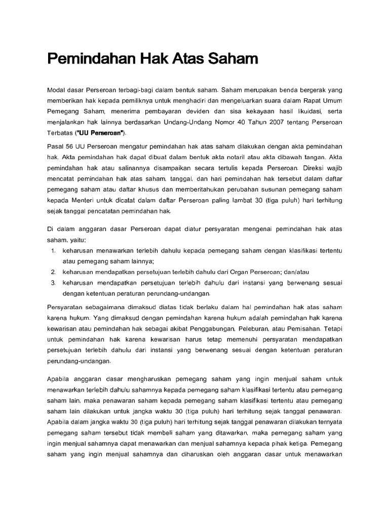 PDF Perseroan Terbatas -2. Pemegang saham yang hendak memindahkan hak atas -saham, harus menawarkan terlebih -3. Pemindahan hak atas saham hanya diperkenankan ---dengan mendapat persetujuan dari : -a -Untuk pertama kalinya buku Perseroan dimulai pada tanggal akta pendirian ini dan ditutup pada... Hibah atas saham - pengacara / lawyer / advokat / kantor pengacara... Akta pemindahan hak atas saham atau salinannya disampaikan secara tertulis kepada Perseroan. Dalam anggaran dasar dapat diatur persyaratan mengenai pemindahan hak atas saham, yaitu: keharusan menawarkan terlebih dahulu kepada pemegang sahamdengan klasifikasi tertentu atau...