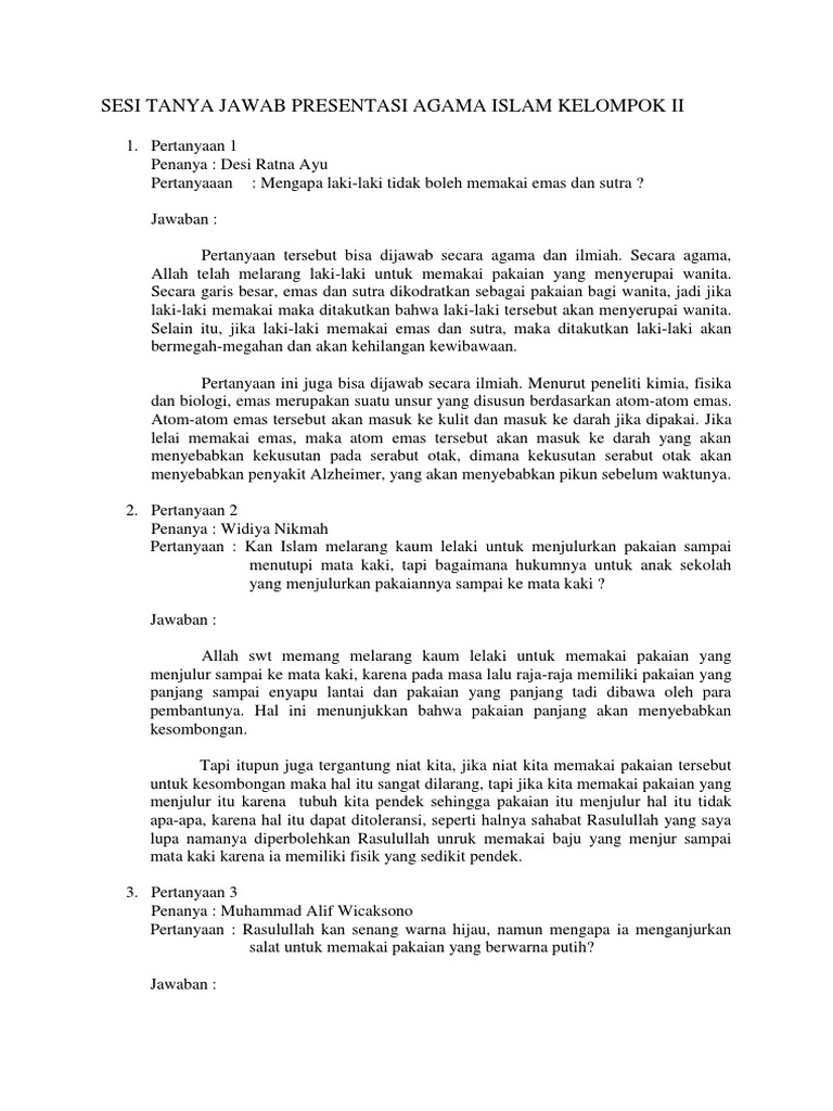 9. Kenapa laki-laki tidak memakai emas dan sutra?(dalam islam) Jawaban: Islam melarang laki-laki mengenakan sutera dan emas demi kebaikan. Penjelasan: Syekh Yusuf al-Qardlawi dalam kitab al-Halal wa al-Haram fi al-Islam menjelaskan, larangan ini mengandung tujuan sosial, yakni agar umat Islam terbebas dari pola hidup boros dan bermewah-mewahan. rumushitung.com › 2013/04/06 › permutasi-dan-kombiPermutasi dan Kombinasi Peluang Matematika - RumusHitung.Com Apr 06, 2013 · 1. suatu panitia yang terdiri dari 1 laki-laki dan 1 perempuan akan dibentuk dari 10 orang laki-laki dan 6 orang perempuan. Berapa banyak cara dapat membentuk psnitia tersebut? 2. Pada saat diadakan pemilihan ketua dan sekretaris kelas, ada 3 calon untuk ketua kelas dan ada 5 calon untuk sekretaris kelas. seruni.id › cerita-dongeng-pendek23 Kumpulan Cerita Dongeng Pendek yang Bisa Diceritakan pada Anak Aug 23, 2021 · “Kenapa aku harus mendapatkan satu telur per hati? Kenapa tidak kuambil semuanya sekaligus agar aku kaya raya?”. Sang istri pun setuju dengan ide jahat itu. Mereka pun meyembelih si angsa dan membelah perutnya. Betapa terkejutnya mereka, alih-alih mendapatkan telur emas, tapi yang didapatkan justru hanya daging dan darah. Lelaki tidak boleh memakai emas ? Ini Alasan Ilmiahnya .. Nah Lho Quote: Pernah Merasa Aneh kenapa Justru Wanita malah terlihat anggun menggunakan Perhiasan Emas, Nah lho , bagaimana dengan nasib ane yang notabene terlahir sebagai Laki. 2. Bagi yang belum pernah ngelihat Emas .. Barangkali lho ada yang tidak tahu apa itu emas ..