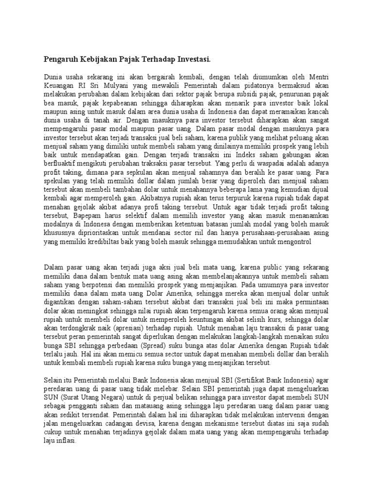 denichaalviana.wordpress.com › 2014/04/18 › pengaruhPengaruh, Dampak, Serta Faktor Yang Mempengaruhi Penanaman ... Apr 18, 2014 · Jelas sekali dari studi literatur bahwa pengaruh pajak terhadap kinerja perekonomian sering ambigu dalam beberapa wilayah dan berubah-ubah dan kontorverisal di wilayah lainnya. Untuk itu harus terdapat beberapa cara dimana suatu kebijakan pajak dapat diadopsi untuk memperbaiki kinerja perekonomian dan aliran FDI.