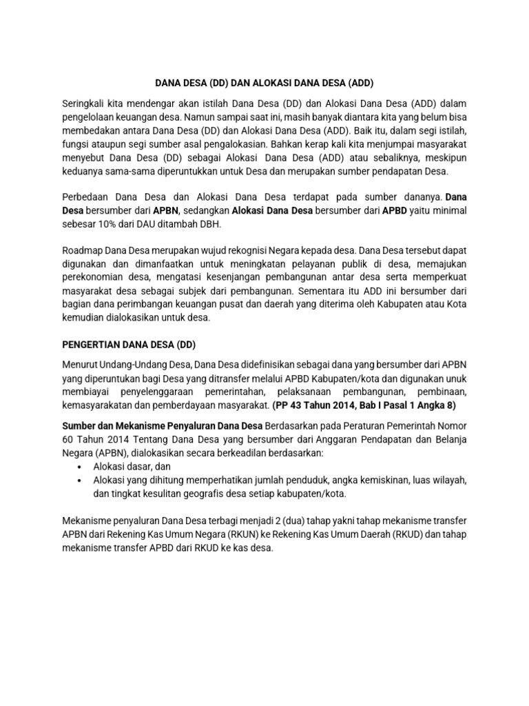 For full functionality of this site it is necessary to enable ... For full functionality of this site it is necessary to enable JavaScript. Here are the instructions how to enable JavaScript in your web browser.33 pages PDF BAB II TINJAUAN PUSTAKA A. Pengelolaan Dana Desa 1 ... Pengertian Dana Desa . Penetapan definisi, pengalokasian dan mekanisme transfer untuk Dana Desa diatur dalam Peraturan Pemerintah (PP) Nomor 60 Tahun 2014 tentang Dana Desa yang bersumber dari Anggaran Pendapatan Belanja Negara (APBN). Berdasarkan PP Nomor 60 Tahun 2014, Dana