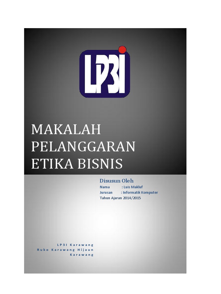 Eko's Blog: Makalah etika bisnis Makalah. Etika bisnis. "Pelanggaran etikabisnis pada pt gudang garam tbk". Penyusun Sedangkan definisi dari etika bisnis adalah pengetahuan tentang tata cara ideal pengaturan dan pengelolaan bisnis yang memperhatikan norma dan moralitas yang berlaku secara... Jelajah Informasi: Makalah Pelanggaran Etika Bisnis PT. PLN Nov 14, 2015 · Bahkan, pelanggaran etika bisnis dan persaingan tidak sehat dalam upaya penguasaan pasar terasa semakin memberatkan para pengusaha menengah kebawah yang kurang memiliki kemampuan bersaing. Oleh karena itu, perlu adanya sanksi yang tegas mengenai larangan praktik monopoli dan usaha yang tidak sehat agar dapat mengurangi terjadinya pelanggaran ... Studi kasus pelanggaran etika bisnis pada pt tirta fresindo jaya Pelanggaran etika bisnis saat ini makin banyak terlihat. Terdapat beberapa aspek yang diperlukan dalam praktek penerapan etika bisnis sehingga bisa meminimalisir pelanggaran etika bisnis yang kini jamak dilakukan oleh para pebisnis dan pihak yang terkait di dalamnya. Makalah Pelanggaran Etika Bisnis Luis Makluf | PDF HALAMAN JUDUL. MAKALAH PELANGGARAN ETIKA BISNIS Disusun Oleh Nama : Luis Makluf Jurusan : Informatik Komputer Tahun Ajaran 2014/2015. LP3I Karawang Ruko Karawang Hijaun Karawang