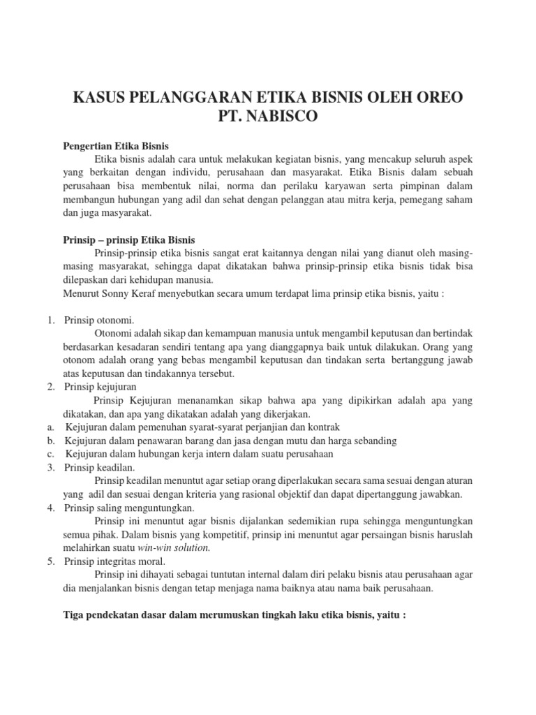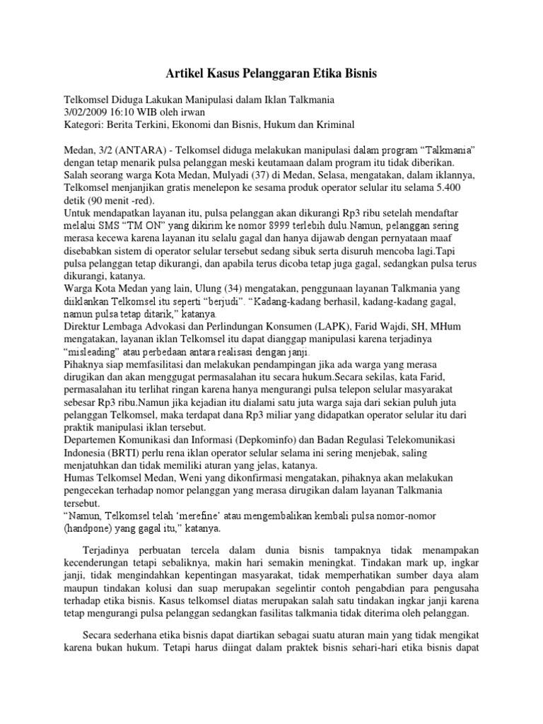 Etika bisnis - Wikipedia bahasa Indonesia, ensiklopedia bebas Etika bisnis adalah tindakan yang dilakukan dalam kegiatan bisnis dengan tidak menyalahi aturan organisasi dan masyarakat. Dalam etika bisnis, setiap kegiatan harus dalam keadaan wajar dan sesuai dengan norma dan etika yang berlaku. Langkah Sederhana: makalah kasus pelanggaran etika bisnis lengkap Namun sampai detik ini pun pelanggaran - pelanggaran etika bisnis masih marak terjadi. Unuk itu dalam makalah ini kita akan mengkaji tentang kasus pelanggaran etika di Indonesia. Mengetahui bagaimana kasus pelanggaran etika bisnis yang terjadi di Indonesia. BAB II.