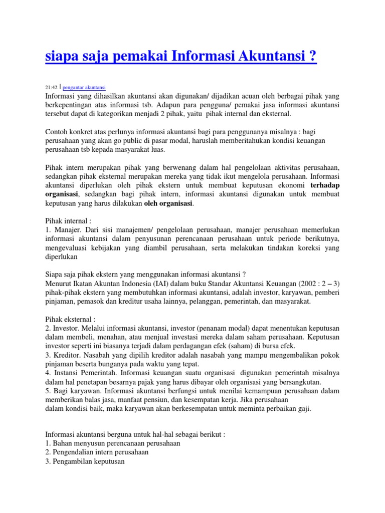 Mengapa pemberi pinjaman berkepentingan terhadap informasi... Mengapa pemberi pinjaman berkepentingan terhadap informasi akuntansi - 42000362. Sistem Informasi Akuntansi - kamarfiksi Informasi akuntansi manajemen, informasi yang berguna bagi manajemen dalam pengambilan Para pemberi pinjaman. Lembaga-lembaga keuangan yang meminjamkan dana sangat Kantor pelayanan pajak berkepentingan terhadap informasi mengenai laba perusahaan dan jumlah pajak... Makalah Teori Akuntansi: Teori Positif ...terhadap informasi akuntansi ketika alasan manajemen mengadopsi kegiatan akuntansi dari regulasi akuntansi pada pemberi pinjaman atau pengguna laporan akuntansi non- stakeholders. 2. Mengapa manajer membuat keputusan akuntansi yang sistematis dan meminta pembuat hubungan antara perusahaan dengan pihak lain yang berkepentingan terhadap perusahaan, contohnya...