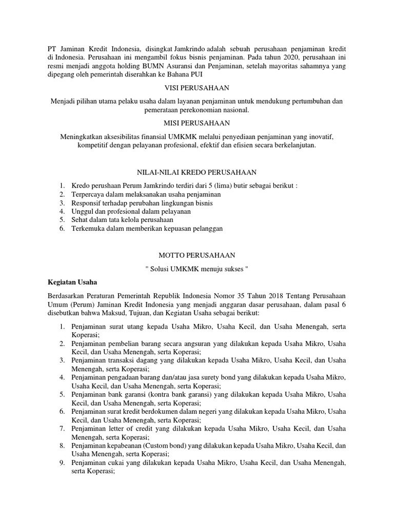 Perum Jaminan Kredit Indonesia (Perum Jamkrindo) merayakan... Direktur Utama Perum Jamkrindo Randi Anto mengatakan, Perum Jamkrindo ingin berkontribusi lebih sebagai tonggak pemberdaya UMKMK yang merupakan tulang punggung perekonomian Indonesia. "Kami tidak ingin terkungkung hanya sebagai penjamin saja. Visi dan Misi Perum Jaminan Kredit Indonesia (JAMKRINDO) Selanjutnya pada bulan Mei 2008, melalui Peraturan Pemerintah No. 41 tanggal 19 Mei 2008 Perusahaan Umum (Perum) Sarana Pengembangan Usaha kembali diubah namanya menjadi Perusahaan Umum (Perum) Jaminan Kredit Indonesia (Perum Jamkrindo). PDF SALINAN Umum (Perum) Jaminan Kredit Indonesia dalam industri penjaminan nasional sebagai upaya untuk. men5rukseskan kebijakan dan program Pemerintah di. melakukan pengembangan usaha dengan menambah kegiatan usaha Perusahaan Umum (Perum) Jaminan Kredit Indonesia