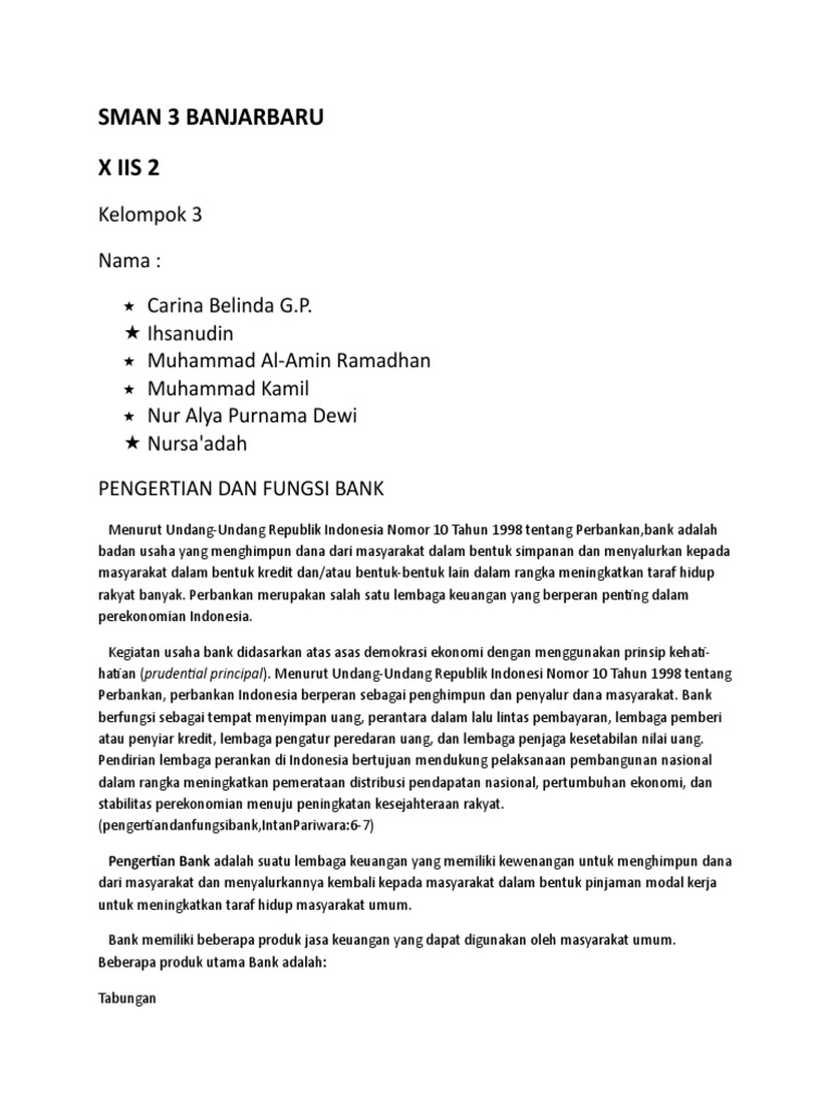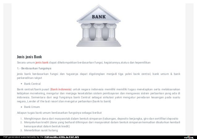 Fungsi bank secara umum. Pengertian Bank Secara Umum, Fungsi, Tujuan, dan Jenis ... Fungsi Bank Secara Umum Ilustrasi Fungsi Bank Seperti yang telah disebutkan pada pengertian Bank di atas, fungsi bank adalah sebagai lembaga yang memiliki wewenang untuk menghimpun dana dari masyarakat serta menyalurkannya kembali kepada masyarakat untuk beragam tujuan. Selain itu, ada 3 fungsi Bank secara spesifik, yaitu: 1. Agent of Trust Latihan Soal Procedure Text dan Manual Terbaru - Dimensi ... 13.11.2018 · Bank Soal / SMK Kelas XI / ... silahkan cek pada link berikut. Soal telah dilengkapi kunci jawaban dan dapat di download secara gratis. Soal Manuals Text Pilihan Ganda. Atau jika teman-teman memerlukan soal pilihan ganda dalam bentuk procedure text (cara membuat / memasak sesuatu), silahkan cek pada link berikut. Procedure Text: Soal dan Jawaban. … Pengertian dan Fungsi, Peran Utama Bank Umum Pada ... Bank Umum: Pengertian - Fungsi - - Financial Intermediation - Menghimpun - Menyalur Dana. Pengertian Bank Umum. Bank umum disebut juga sebagai bank komersial. Bank umum pada dasarnya melaksanakan kegiatan usaha secara konvensional atau berdasarkan prinsip syariah, yang kegiatannya memberi jasa dalam lalu lintas pembayaran. Pengertian Bank dan Fungsi Bank Secara Umum - Berita ... Bank merupakan lembaga keuangan yang melaksanakan berbagai macam jasa, seperti pinjaman, mengedarkan mata uang, bertindak sebagai tempat penyimpanan benda-benda berharga, membiayai usaha perusahaan, dan lain-lain. Fungsi Bank Secara Umum Fungsi Bank Berikut ini beberapa fungsi dari adanya bank: 1. Menghimpun Dana Dari Masyarakat
