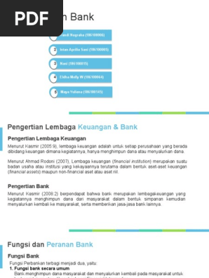 Fungsi dan Peranan Bank Secara Umum | Boele21's Blog Fungsi Bank 1. Penghimpun dana Untuk menjalankan fungsinya sebagai penghimpun dana maka bank memiliki beberapa sumber yang secara garis besar ada tiga sumber, yaitu: a. Dana yang bersumber dari bank sendiri yang berupa setoran modal waktu pendirian. b. Dana yang berasal dari masyarakat luas yang dikumpulkan melalui usaha perbankan seperti usaha simpanan giro, deposito dan… 43 pengertian dan fungsi bank - Solusi Keuangan Fungsi Bank Secara Umum Pengertian Bank | Fungsi, Tugas, Sejarah, dan Jenis Bank ... Sebagai lembaga kepercayaan ( agent of trust ), bank memegang fungsi financial intermediary. Yakni menghimpun uang dari masyarakat yang kelebihan dana (penyimpan dana/kreditur) dan menyalurkan kepada pihak yang membutuhkan (peminjam dana/debitur). Bank Umum: Pengertian, Fungsi, dan Kegiatan Usahanya Bank umum adalah bank yang melaksanakan kegiatan usaha secara konvensional dan atau berdasarkan prinsip syariah, yang dalam kegiatannya memberikan jasa dalam lalu lintas pembayaran. Bisnis perbankan merupakan bisnis yang rumit dan berisiko. Seiring dengan peningkatan risiko, bank pun harus melakukan peningkatan modal. Pengertian Bank: Fungsi, Dan Jenis-Jenis Bank Di Indonesia ... Pengertian Bank - Menurut Bank Indonesia sesuai UU Perbankan 1992, struktur perbankan di Indonesia terdiri atas bank umum dan BPR. Perbedaan utama keduanya adalah kegiatan operasionalnya. Simak lebih banyak penjelasan mengenai Bank, mulai dari pengertian, fungsi dan berikut ini Grameds.