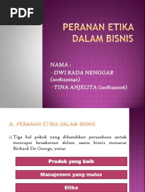 Peranan Etika Dalam Bisnis | PDF - Scribd 3. Peranan Etika dalam Bisnis ... etika, maka cepat atau lambat akan hancur dengan sendirinya. Beberapa dekade terakhir ini, etika dalam bisnis dianggap sangat ... Peranan Etika dalam Bisnis | learnourworld Aug 24, 2011 · PERANAN ETIKA DALAM BISNIS Tiga hal pokok yang dibutuhkan perusahaan untuk mencapai kesuksesan dalam suatu bisnis menurut Richard De George, yaitu : 1. Produk yang baik 2. Manajemen yang mulus 3. 5 Manfaat Etika Bisnis Untuk Perusahaan - Jurnal.id Memiliki Citra Baik di Mata Pelanggan · Perusahaan Menjadi Tepercaya · Memaksimalkan Keuntungan · Memerhatikan Kepentingan Bersama · Menjunjung Nilai Moral · Related ... Pentingnya Menerapkan Etika dalam Berbisnis - Akseleran Blog 11 Mar 2020 — Etika bisnis dapat diartikan sebagai peraturan tidak tertulis sebagai landasan norma dan perilaku yang harus dipatuhi oleh seluruh lapisan ...