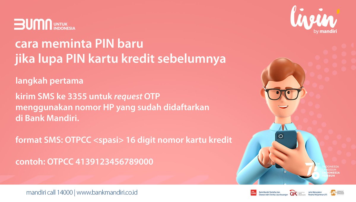 Pengiriman Nomor PIN Kartu Kredit | Mafiakartukredit.com Pengiriman nomor PIN kartu kredit kurang lebih 1 bulan sejak kartu kredit diterima. Kartu kredit yang pertama kali kita terima masih membutuhkan sebuah nomor PIN (Personal Identification Number). Mirip nomor PIN kartu ATM atau kartu debet. Lalu apa gunanya nomor PIN ini? Lupa PIN Kartu Kredit Mandiri ? Begini Solusinya - Lupapin Dalam hal problem lupa PIN kartu kredit, setiap pengguna tidak usah takut atau khawatir karena ada cara untuk mengatasinya. Sebelum kalian pergi ke ATM Mandiri, pertama harus meminta kode OTP terlebih dahulu melalui SMS dengan format OTPCC16 digit nimr kartu lalu kirim ke 3355. 3 Cara Buat PIN Kartu Kredit Mandiri dan Ganti Jika Lupa Ketika kamu lupa PIN kartu kredit dari Mandiri, maka sebaiknya kamu segera menghubungi mandiricall 14000 atau mendatangi cabang Bank Mandiri terdekat untuk mengecek apakah kartu kredit Mandiri mu sudah terblokir karena lupa PIN atau tidak. Lupa PIN Kartu Kredit Mandiri? Ini Solusi Mudah Mengatasinya Ada banyak sekali kartu kredit yang diterbitkan oleh Mandiri. Berbicara mengenai kartu kredit, bagi kalian pemilik kartu kredit Mandiri tentu sudah tidak Belum lama diwajibkan untuk membuat PIN kartu kredit, ada beberapa orang yang mengeluh bagaimana cara mengatasi lupa PIN kartu kredit...