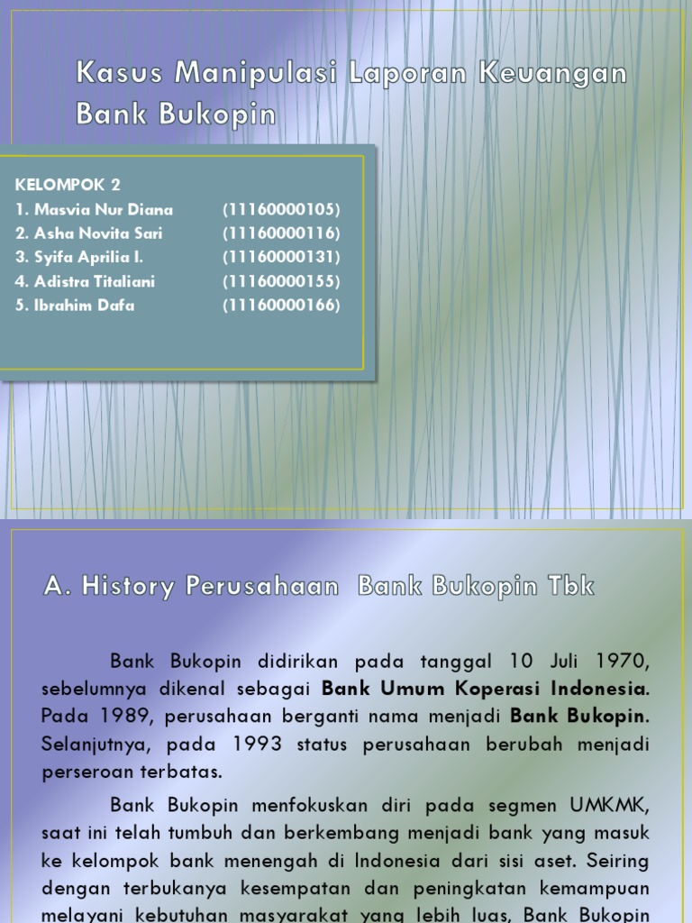 Analisis Kasus Bukopin [34wppmme7ml7] Langkah yang dilakukan adalah rights issue dengan menerbitkan saham baru sebesar 30% dan divestasi 40% saham Bank Syariah Bukopin (BSB). Analisis Kemungkinan Adanya Rekayasa Laporan Keuangan Isu Pada Laporan keuangan tahun 2017, Bukopin yang melakukan penyajian kembali atas laporan keuangannya untuk 31 Desember 2016 dan 2015.