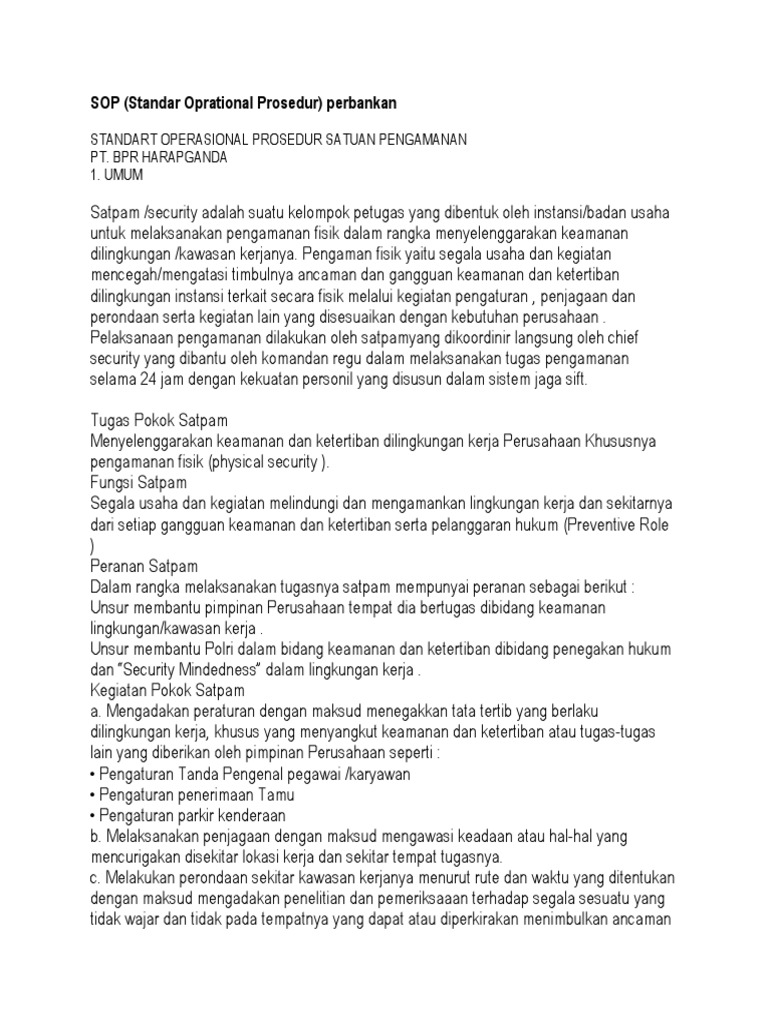 41 tugas pokok satpam bank - Solusi Keuangan Tugas pokok satpam bank. Non Bank Staff bertugas dalam mengamankan kekayaan kantor serta pemeliharaan dan pengurusan rumah tangga lainnya Bagian-bagian dan tugas-tugas pokok non bank staff a. Satpam bertugas untuk siap siaga terhadap situasi kantor, memantau keluar masuk nasabah ke kantor,menfull (mengeluarkan dan memasukkan uang dari khasanah ... Standart Operasional Prosedur (Sop) Satpam Sebagai Front ... TUGAS SATPAM DI DALAM BANK: · Membukakan pintu ketika nasabah datang · Memberikan pertanyaan tentang tujuan nasabah · Menjelaskan tentang cara melakukan transaksi kemana tujuanya nasabah · Mengarahkan nasabah ke tempat transaksinya.. TUGAS SATPAM KETIKA NASABAH MENGELUH · Menanyakan apa yang menjadi masalah nasabah Prihal tugas dan tanggung jawab security - Blogger Prihal tugas dan tanggung jawab security. A.PENDAHULUANI.Secara umum, keamanan personil dan asset di seluruh area Gedung merupakan tanggung jawabPerusahaan Satpam dengan tujuan melindungi, menjaga dan mencegah dari gangguan keamanan baik dari luar maupun dari dalam serta menciptankan situasi tertib, aman dan nyaman. 4 Gaji Satpam Bank : BRI, Mandiri, BCA, Dan BNI Terbaru ... Satpam (Satuan Pengamanan) memiliki tugas pokok untuk menyelenggarakan ketertiban dan keamanan lingkungan tempat kerja, yang meliputi aspek personel, pengamanan fisik, informasi, serta pengamanan teknis lainnya. Peran dan tanggung jawab secara rinci untuk semua profesi satpam sama, termasuk satpam lembaga keuangan bank.