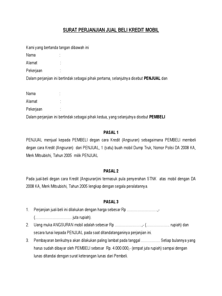42 surat perjanjian kredit mobil - Solusi Keuangan Contoh Surat Perjanjian Jual Beli Mobil Kredit Dealer mobil menggunakan perjanjian pembelian mobil, atau perjanjian penjualan mobil, untuk menyelesaikan penjualan. Surat Perjanjian Jual Beli di setujui, ditandatangani dan juga dibuat rangkap dua materai cukup, serta keduanya memiliki kekuatan yang sama.