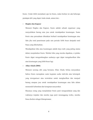 1UMKM KWU Analisis Bisnis & Kelayakan Usaha.pptx ... 3 PENGERTIAN STUDI KELAYAKAN USAHA Studi kelayakan usaha ialah suatu penelitian tentang layak tidaknya suatu bisnis dilaksanakan dengan berhasil dan menguntungkan secara kontinyu. Studi ini pada dasarnya membahas berbagai konsep dasar yang berkaitan dengan keputusan dan proses pemilihan proyek bisnis agar mampu memberikan manfaat ekonomis dan sosial sepanjang waktu. Contoh Analisis dan Studi kelayakan usaha - Bisnis dan ... Dari hasil analisis dan studi kelayakan usaha di atas dapat di ketahui bahwa usaha warung bakso dapat menghasilkan laba sebesar 12.123.947, dapat di hitung pula payback periode nya adalah selama sekitar 2 bulan (22.396.000 : 12.123.947), sehingga dari hasil tersebut dapat di simpulkan bahwa usaha warung bakso layak untuk di jalankan.
