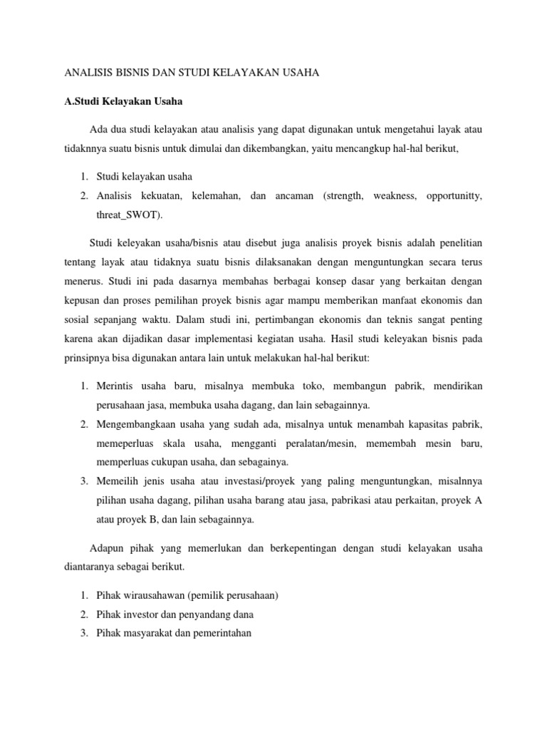 ANALISIS KELAYAKAN USAHA DAN ANALISIS SWOT - Academia.edu Untuk itu, ada dua studi atau analisis yang dapat digunakan untuk mengetahui layak tidaknya suatu bisnis dimulai atau dikembangkan, yaitu: 1. Studi kelayakan usaha (feasibility study of businesses) 2. Analisis SWOT (Strengh-kekuatan, Weakness-kelemahan, Opportunity- peluang, Threat-ancaman) I.2 Rumusan Masalah 1.